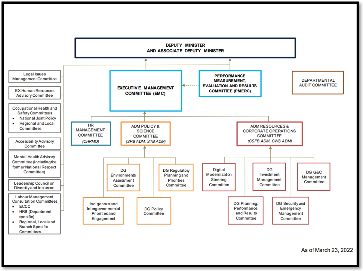 In addition, there are several other ADM and Director General committees in the ECCC governance structure (see Appendix B). These committees provide direction and feedback on specific departmental areas such as information management and information technology, emergency and security management, project management, human resources, allocation and use of departmental operating and capital resources, corporate policies, grants and contributions, Indigenous and interdepartmental priorities and engagement, environmental assessment and regulatory and performance and results.