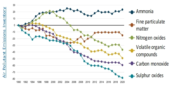 The graphic demonstrates that pollutant emissions from Ammonia have gradually risen from 1990 to 2020, shown in a dark blue line. On the other hand, pollutant emissions for fine particulate matter, shown in a red line, nitrogen oxides, shown in a green line, volatile organic compounds, shown in a yellow line, carbon monoxide, shown in a purple line, and sulphur oxides, shown in a turquoise line, have steadily declined from 1990 to 2020Major areas of work