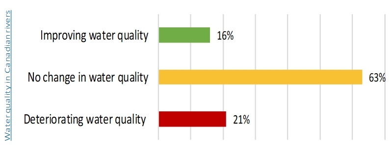 The bar graph shows that 16% of communities demonstrated improved water quality and has a green bar demonstrating that percentage, 63% of communities demonstrated not change in water quality and has an orange bar demonstrating that percentage, and 21% of communities demonstrated deteriorating water quality and has a red bar demonstrating that percentage.