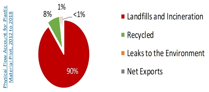 The pie chart shows that 90% ends up in landfills or incineration and is in white text on a red background, 8% is recycled and the section is displayed in green, and 1% ends up in the environment and the section is displayed in orange, and less than 1% is exported, and the section is displayed in grey.