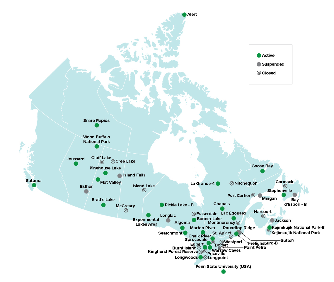 | Site name | Province/Territory | Status | Measurement type |