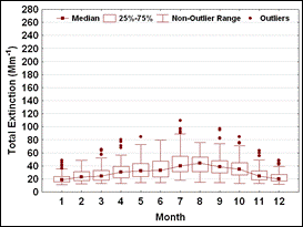 At the urban Beacon Hill site in Seattle (Figure 9.2 a), observed (unadjusted) median extinction was statistically higher (p<0.05) during the fall months compared to the spring and summer for the period 2001 to 2011. The occurrences of poor visibility conditions, as indicated by the upper non-outlier range and outliers, were more frequent from September to February. At this site, smoke from wood burning may play a role during the colder months and/or it may be attributable to increased humidity and condensation of semi-volatiles due to the cooler temperatures and reduced boundary layer heights. Observations from the more rural Mount Rainier site show the opposite pattern (Figure 9.2 b), with a statistically higher (p<0.05) median extinction during the summer compared to all other seasons. The seasonal pattern at Mount Rainier may be related to a combination of smoke from forest fires and biogenic secondary organic particulate formation. In addition, as the Mount Rainier site is situated at an elevation of 439 m, the effects of boundary layer height on extinction during winter time may not be as significant as those at lower elevation sites.