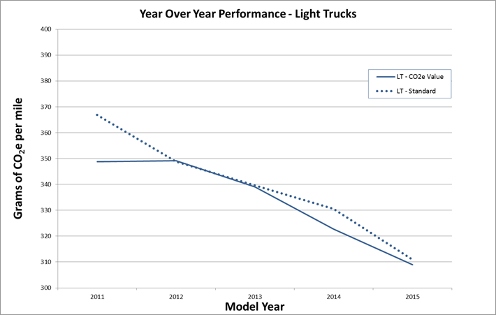 The results from the 2011 to 2015 model year regulatory reports indicate that the aggregated fleet average compliance values for both passenger automobiles and for light trucks are at or below the applicable fleet average standard for each year. During this period, the aggregate compliance values for passenger automobiles have decreased from 255 to 229 grams per mile, a 10.2% reduction and light trucks have decreased from 349 to 309 grams per mile, an 11.5% reduction.