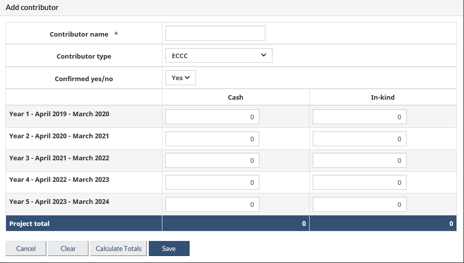 ![]() Screen capture from the Climate Action Fund online application with the heading “Add contributor,” the fields “contributor name, contributor type, fiscal year breakdown,” and the buttons to calculate totals or save the data. |