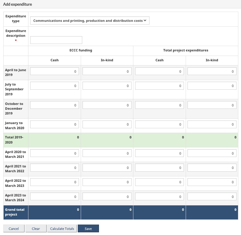 ![]() Screen capture from the Climate Action Fund online application with the heading “Add expenditure,” the fields “expenditure type, expenditure description, ECCC funding and total project expenditures,” and the buttons to calculate totals or save the data. |