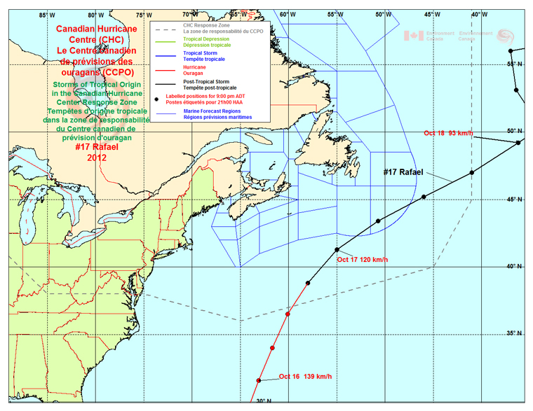 The CHC issued 18 unique information statements for Rafael. During its post-tropical phase, Rafael travelled rapidly across the southern Grand Banks with a forward speed near 45 knots (80-85 km/h). Special statements were issued to alert the coastal communities in southeastern Newfoundland of rapid changes in water levels and ocean currents. This unique effect occurs when sharp wind and pressure features rapidly cross shallow offshore waters. Fortunately these fluctuations occurred before the local high tide, so there were no reports of flooding. Hurricane-force wind warnings were posted for the southernmost portion of the Grand Banks.