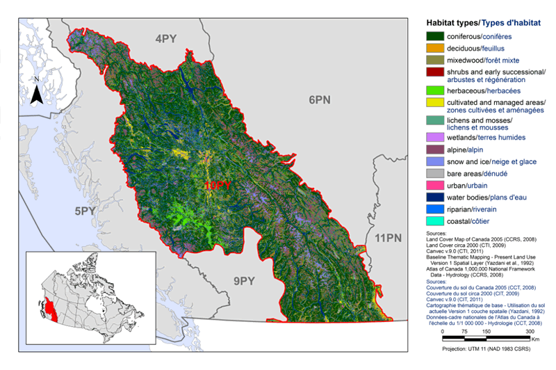 The remaining text in the legend is the following: Sources: Land Cover Map of Canada 2005 (CCRS, 2008), Land Cover circa 2000 (CTI, 2009), Canvec v. 9.0 (CTI, 2011), Baseline Thematic Mapping - Present Land Use Version 1 Spatial Layer (Yazdani et al., 1992), Atlas of Canada 1,000,000 National Framework Data - Hydrology (CCRS, 2008). Sources: Couverture du sol du Canada 2005 (CCT, 2008), Couverture du sol circa 2000 (CTI, 2009), Canvec v. 9.0 (CTI, 2011), Cartographe thématique de base - Utilisation du sol actuelle Version 1 couche spatiale (Yazdani, 1992), Données-cadre nationales de l'Atlas du Canada à l'échelle du 1/1 000 000 - Hydrologie (CCT, 2008). There is also a visual representation of scale for the map in the legend which indicates 0, 75, 150 and 300 kms. The Projection is UTM 11 (UTM 1983 CSRS).