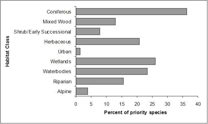 - Figure 3. Percent of priority species that are associated with each habitat type in BCR 10 Pacific and Yukon Region.