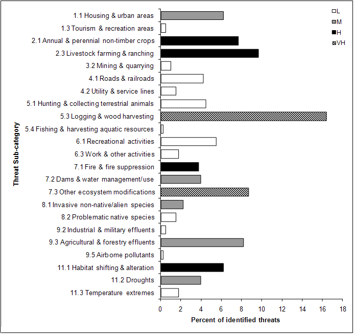 Each bar represents the percent of the total number of threats identified in each sub-threat category in BCR 10 (for example, if 100 threats were identified in total for all priority species in BCR10, and 10 of those threats were in the category 1.1 Housing and urban areas, the bar on the graph would represent this as 10%). Shading in the bars (VH = very high, H = high, M = medium and L = low) represents the rolled up magnitude of all threats in each threat subcategory in the BCR. 5.1 Hunting and collecting terrestrial animals refers primarily to lead poisoning of waterfowl from consumption of lead shot. Threats under 6.1 Recreation activities and 6.3 Work and other activities refer to the impacts of human disturbance from these activities. Threats under 7.3 Other ecosystem modifications are primarily changes in forest structure due to the Mountain Pine Beetle outbreak. 8.2 Problematic native species refers primarily to Brown-headed Cowbird parasitism. 9.3 Agricultural and forestry effluents refers primarily to effects of pesticide use.