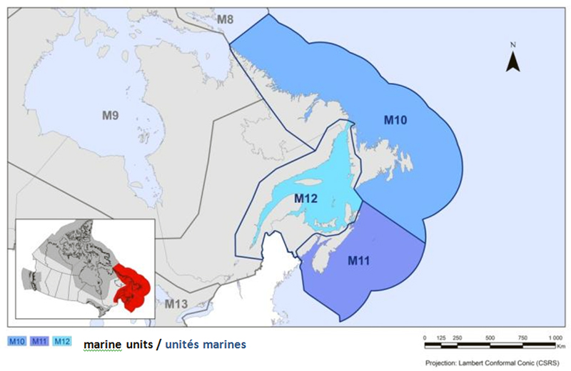 Map of the Marine Biogeographical Units (MBUs) of eastern Canada. The map’s extent includes the western shore of Hudson Bay to Newfoundland’s offshore areas. M10, M11 and M12 are highlighted, while the adjoining borders of M8, M9 and M13 are visible. M10 covers most of the waters off Labrador and Newfoundland, M11 covers the waters off Nova Scotia, and M12 covers the Gulf of St Lawrence. There is a small map of Canada inset lower left, with the maritime region highlighted. The bilingual legend, along with the scale and projection of the map, appear below.