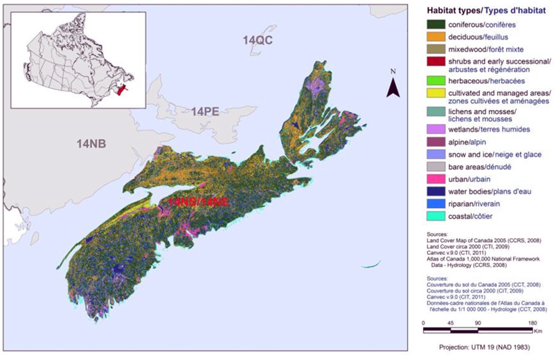 BCR 14 NS covers all of Nova Scotia. The various habitat types that exist in the BCR are shown on the map, and are explained in the following bilingual legend (appearing to the right of the map):