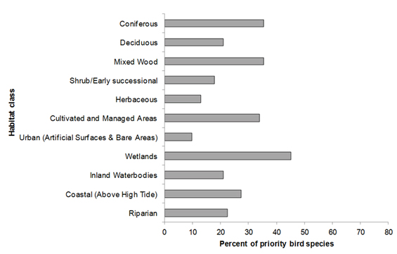 - Figure 4: Percent of priority bird species that are associated with each habitat type in BCR 14 NS.