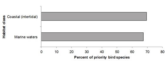 There are 62 priority bird species on land and 32 priority bird species in marine habitats. Wetlands are used by the greatest number of priority bird species (45%), while 35% use forests and 34% use cultivated and managed areas. There is a variety of current and potential threats to the region’s avifauna. Many of these threats are related to land use and, in particular, forestry and agricultural activities and include loss or fragmentation of all forest types because of logging activities; loss or fragmentation of habitats due to conversion into farmlands; and decreases in diet quality, in the health of birds, or in prey availability due to the contamination of food sources from biocides used in the forestry or agricultural industries. There is also a variety of threats related to urban or recreational housing expansion along the coastline including loss of habitat, human disturbances along the coast and shoreline protection of coastal infrastructure (such as roads and houses).