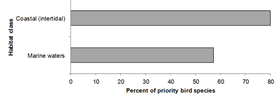Common threats to priority bird species in all three coastal habitats include disturbances due to ATV traffic, dogs walking off-leash and other human uses of beaches, and loss of specific habitat features due to changes in sedimentation patterns caused by installation of riprap. Priority birds in coastal habitats are also threatened by ocean oil-spill events and oil discharges from shipping activities. Recommended conservation actions to address these threats include managing coastal recreational and commercial activities to minimize disturbance to priority species; raising public awareness of priority birds and their habitat needs and the impacts of disturbance in coastal areas; and developing beneficial management practices and avoidance guidelines to manage shipping activities and minimize accidental oil discharges.