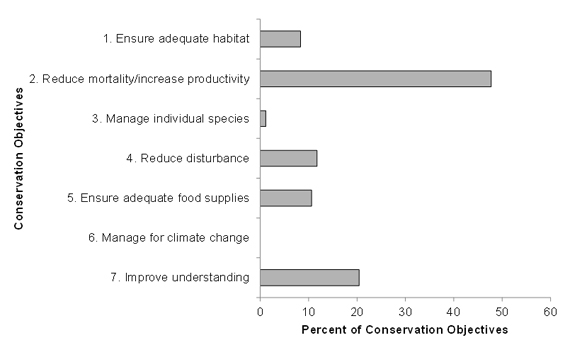 A horizontal bar graph indicating the percent of all conservation objectives (x axis) assigned to each conservation objective category (y axis; ensure adequate habitat, reduce disturbance, etc.) in MBU 12 NS Atlantic Region.