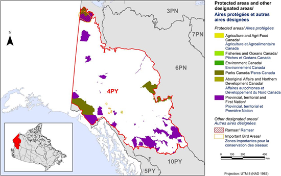 BCR 4 includes within its boundaries four national parks (Ivvavik National Park, Vuntut National Park, Kluane National Park, and part of Nahanni National Park Reserve), one National Wildlife Area (Nisutlin River Delta NWA), and a number of Provincial and Territorial parks. Overall, 13% of BCR 4 is in protected areas (Fig. 2); however, this varies by jurisdiction (12% in Yukon, 22% in British Columbia) and land cover (from 42% of snow and ice to 7.4% of forest in protected areas within BCR 4, using Earth Observation for Sustainable Development (EOSD) land cover data). Additional protected areas are planned in British Columbia under the Taku Atlin Land Use Plan, and proposed in Northwest Territories.
