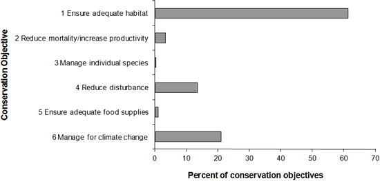 In BCR 4, most conservation actions fell under the related objectives of ensuring adequate habitat and managing for climate change (Fig. 6). In addition, many actions were recommended under the objective of reducing disturbance. For BCR 4, we did not include research and monitoring (“7 Improve Understanding”) as a conservation objective, because the need for improved knowledge encompasses virtually all species in all habitats in this remote region. Knowledge gaps are discussed separately under the “Research and Population Monitoring Needs” section of the full strategy.