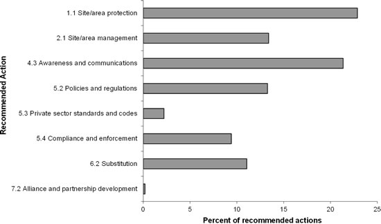 Many recommended actions fell under the “Awareness and communications” sub-category, reflecting the need to inform land managers and the public of the status and conservation needs of birds in the region. Many actions under “Policies and regulations” and “Substitution” involve supporting efforts to reduce greenhouse gas emissions.