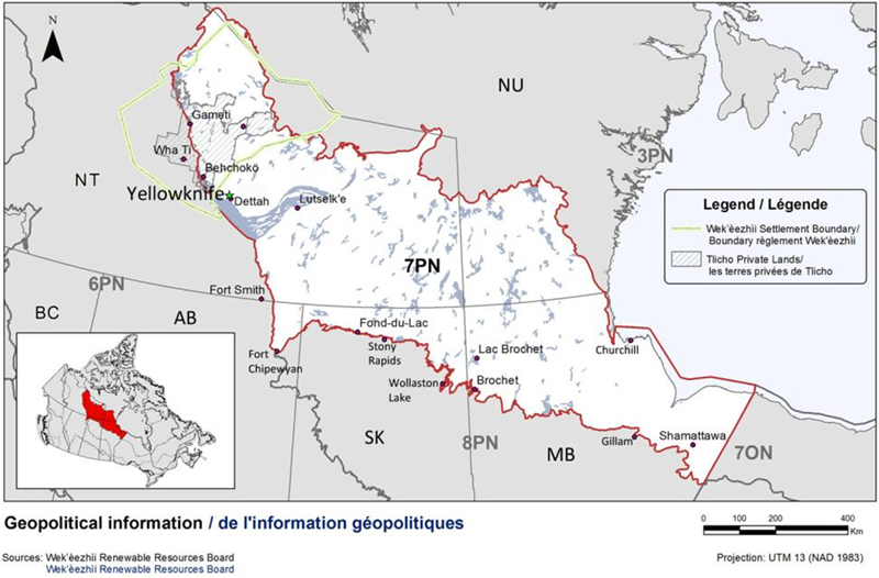 There are two bilingual legends for this map. The first is inset and says: “Legend/Légende, Wek'èezhii Settlement Boundary/Boundary règlement Wek'èezhii, Tlicho Private lands/les terres privées de Tlicho”. The second legend appears below the map and says: “Geopolitical information/de l'information géopolitiques. Sources: Wek'èezhii Renewable Resources Board, Wek'èezhii Renewable Resources Board”