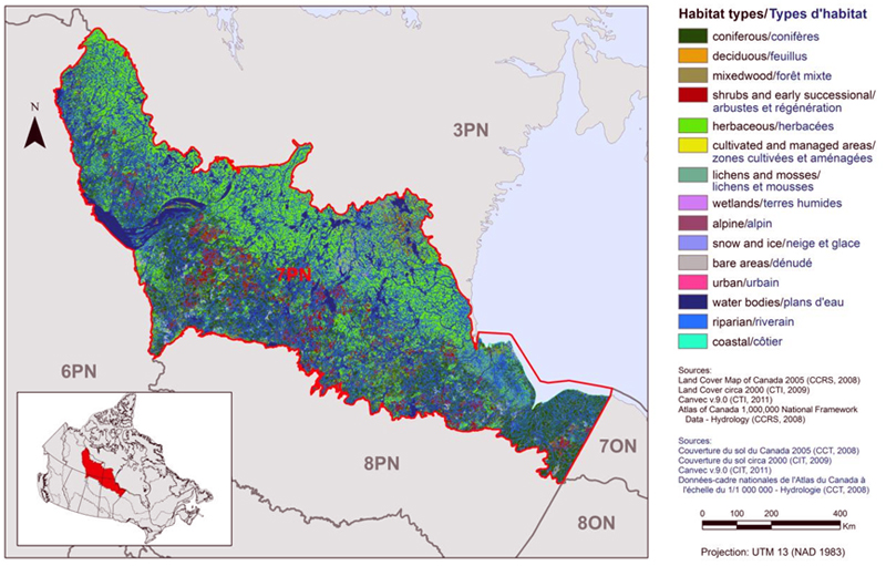 The remaining text in the legend is the following: Sources: Land Cover Map of Canada 2005 (CCRS, 2008), Land Cover circa 2000 (CTI, 2009), Canvec v 9.0 (CIT, 2011), Atlas of Canada 1,000,000 National Framework Data - Hydrology (CCRS, 2008). Sources: Couverture du sol du Canada 2005 (CCT, 2008), Couverture du sol circa 2000 (CIT, 2009), Canvec v 9.0 (CIT, 2011), Données-cadre nationales de l'Atlas du Canada à l'échelle du 1/1 000 000 - Hydrologie (CCT, 2008). There is also a visual representation of scale for the map in the legend which indicates 0, 100, 200 and 400 kms. The Projection is UTM 13 (NAD 1983).