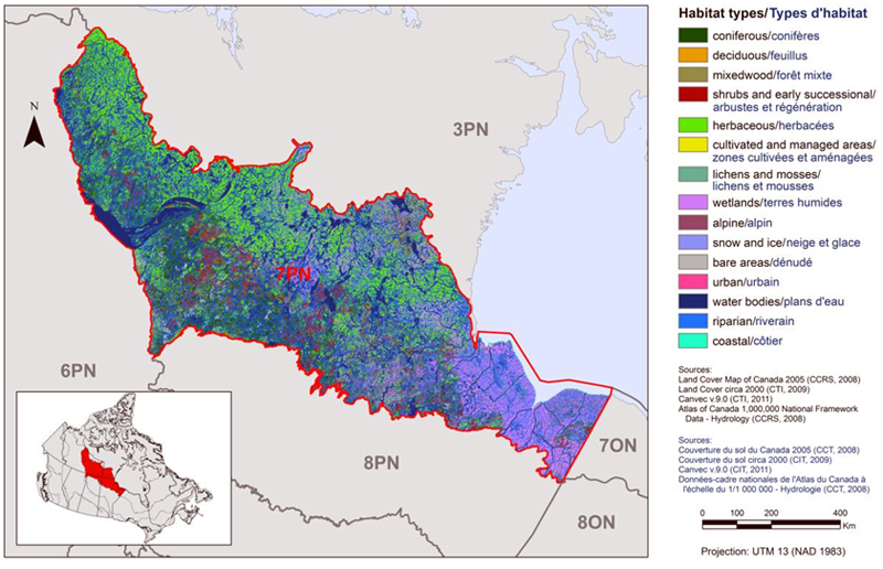 The most common habitat types visible at this scale in BCR 7PN are herbaceous (including tundra; more common in north), coniferous forests (more common in south) and waterbodies throughout. There is a moderate amount of shrub and early successional habitat in the southern 2/3 of the BCR, corresponding more or less to the burned areas. Riparian areas appear in high concentration in the east of the BCR (Hudson Plain). The other habitat categories are not obvious at this scale.