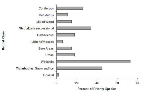 Figure 9 provides a summary of habitats used by the priority species. Habitat use for each species was not ranked, so the figure does not represent a corresponding overall importance of particular habitats in the BCR. It only shows, for example, that many priority species use wetlands or waterbodies as one of their main habitat choices.