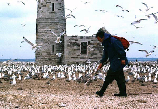 A photograph of Chip Weseloh (Employee of the Canadian Wildlife Service) walking with a backpack and looking on the ground while completing a Caspian Tern nest count on a ridge of Zebra and Quagga Mussel shells on Mohawk Island National Wildlife Area. There is a lighthouse and approximately a hundred gulls (both resting and in flight) in the background.