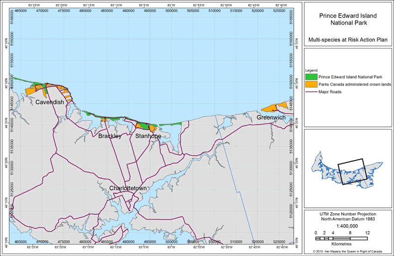The geographic scope of this action plan includes all lands and waters within the boundary of PEINP, as described in Schedule 1 of the CNPA, as well as 41 parcels of federally-owned Crown lands adjacent to the Park that are administered by Parks Canada, including Greenwich, Brackley, Dalvay and Cavendish areas totaling 18.8 km² (Figure 1). This multi-species action plan has been written specifically for these federally-owned lands because the Parks Canada Agency (PCA) is legally responsible for species at risk on Parks Canada administered lands, has the ability to take direct conservation action, and deals with different threats, legislation, and management priorities.