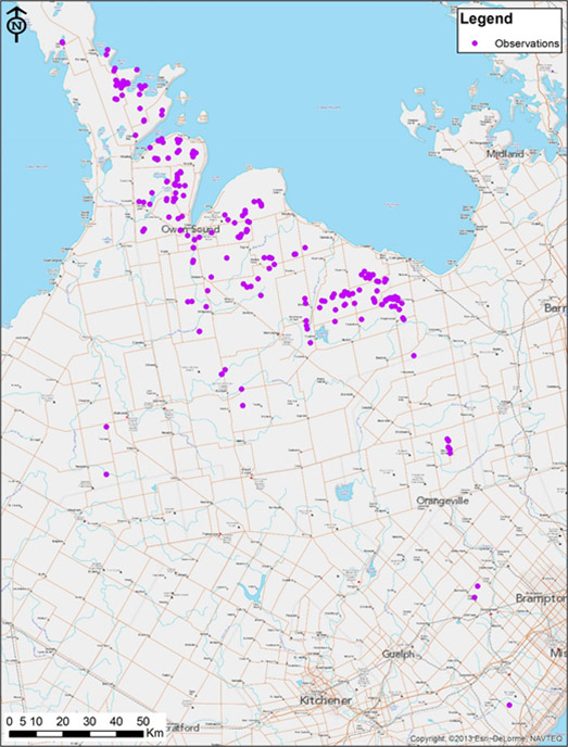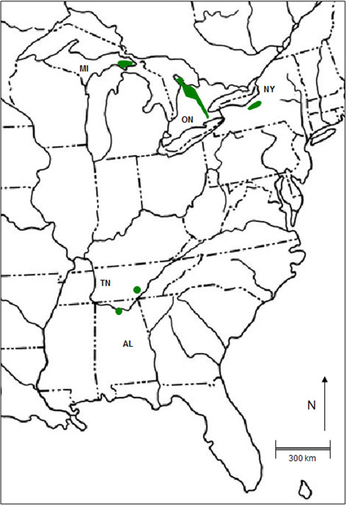 - Figure 3. Canadian range of American Hart's-tongue Fern. All subpopulations are in the province of Ontario.