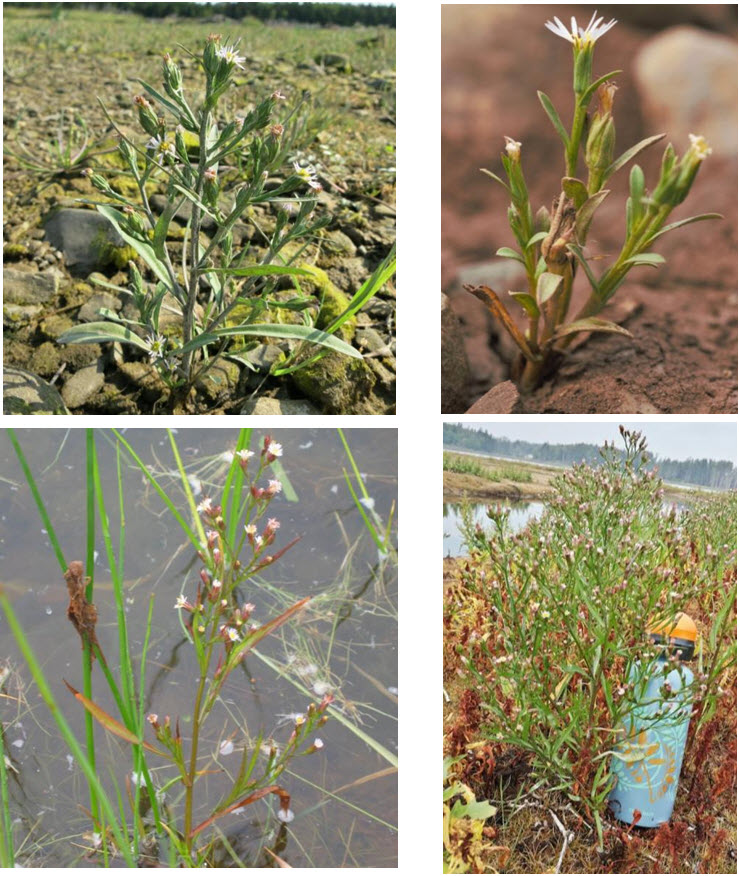 - Figure 1. Annual Saltmarsh Aster (Symphyotrichum subulatum) representative of the “Bathurst Aster” form (large and small individuals, top, from Escuminac River, Quebec on left, and Teagues Brook, New Brunswick on right) and representative of the nominate (non-Bathurst) form with taller stature, more flower heads, more pointed and less fleshy leaves, from Condons Pond, Prince Edward Island (bottom).