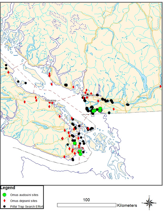 - Figure 4. Search effort for the Audouin's Night-stalking Tiger Beetle. Pitfall trap sites are represented as small black dots. Pitfall trapping within southwestern B.C. from 1989 - 2012 amounts to a minimum of 722 sites and more than 73,000 trap nights (124 sites on Vancouver Island, 95 sites on southern Gulf Islands, 96 sites on the Sunshine Coast and 406 sites in the Lower Fraser Valley). Numerous traps are sometimes represented by one dot on the map. Specimen records for Omus dejeani (the Greater Night-stalking Tiger Beetle) are another measure of search effort for this species. Map created by Orville Dyer (B.C. Ministry of Forests, Lands and Resource Operations) September 20, 2013.