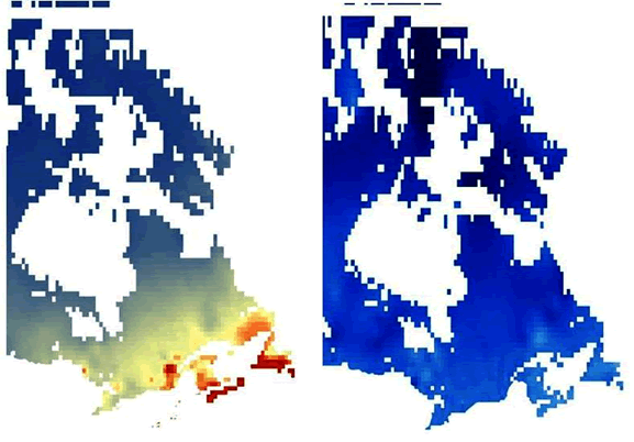 - Figure 6. The modelled ideal climate for Anzia colpodes using annual precipitation and mean maximum monthly temperature. The map on the left is for climate data observed from 1961 to 1990 and the map on the right is for climate data predicted to 2099. The yellow, orange and red zones indicate areas of increasingly more ideal climate for this lichen. The blue and dark blue areas show less ideal climates