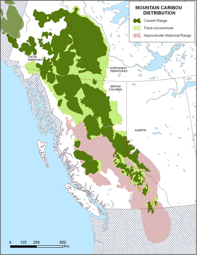Caribou are an iconic Canadian wildlife species appearing on the Canadian 25 cent coin, and are one of Canada’s most widely distributed large mammals (Species at Risk Public Registry 2013). Western mountain caribou display particular adaptations to weather and topographic conditions in mountainous forests along the western spine of the North American continent. By virtue of their reliance on large tracts of older forest, they are highly sensitive to forest clearing and are regarded as indicators of older and intact forest ecosystems. Over 90% of the distribution of western mountain caribou occurs in Canada (see Global Distribution).