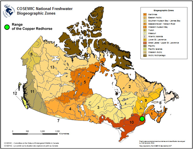 - Figure 4. Canadian range of the Copper Redhorse (map of the biogeographic zones of Canada produced by COSEWIC (2007)). COSEWIC. 2007. COSEWIC National Freshwater Biogeographic Zones.