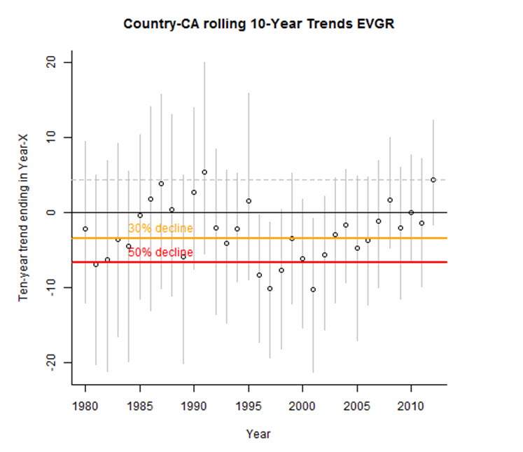- Figure 7. Ten-year rolling trend for Evening Grosbeak between 1980 and 2012 in Canada based on Christmas Bird Count data.
