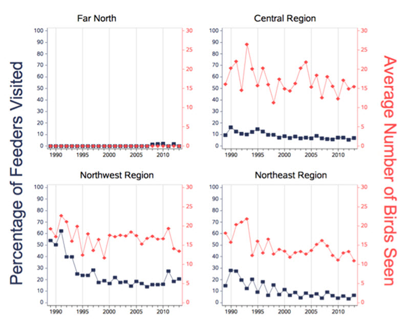 - Figure 8. Trends in the percentage of feeders visited and the average number of birds seen at feeders in four regions of North America from Project FeederWatch, 1989-2014. Far North = Northwest Territories; Northwest Region = British Columbia and Alberta; Central Region = Saskatchewan and Manitoba; Northeast Region = Ontario, Quebec, and Atlantic provinces.