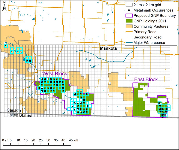 - Figure 7. Known range of Mormon Metalmark Prairie Population near Grasslands National Park (GNP)(SK CDC 2012; Wick 2013, unpublished data). The area has not been systematically searched and may contain undocumented sites
