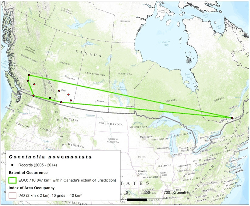 - Figure 5. Recent extent of occurrence and index of area of occupancy for the Nine-spotted Lady Beetle based on museum collections and recent surveys (2005 - 2014).
