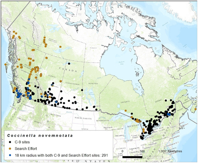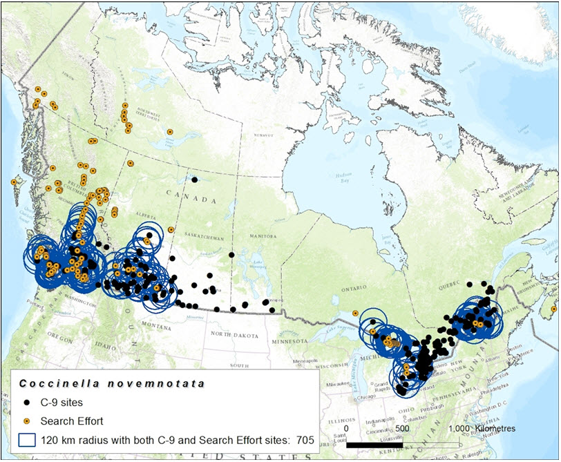 - Figure 8. Search effort sites (orange dots) with a 120 km radius (blue circles) overlap with 729 known sites for the Nine-spotted Lady Beetle (Coccinella novemnotata) (black dots).