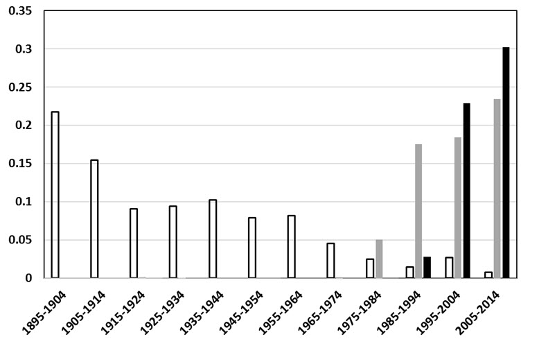 - Figure 9. Changes in relative abundance of the native Nine-spotted Lady Beetle (Coccinella novemnotata) (white fill), and the non-native Seven-spotted Lady Beetle (Coccinella septempunctata) (grey fill) and Multi-coloured Asian Lady Beetle (Harmonia axyridis) (black fill) compared to all databased Coccinellidae in BC, AB, SK, MN, ON and QC.