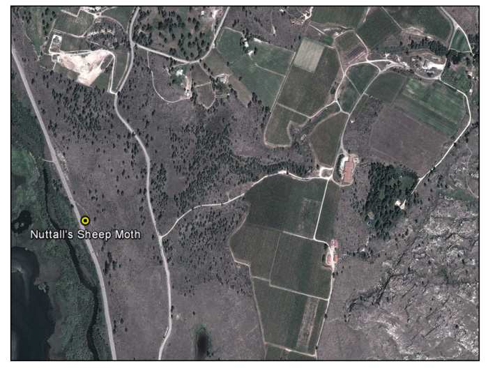- Figure 9. GoogleEarth image (8/3/2012) of Nuttall's Sheep Moth record (S. Ife) east of Vaseux Lake showing vineyards, aggregate extraction, and residential development surrounding remaining Antelop-brush habitat