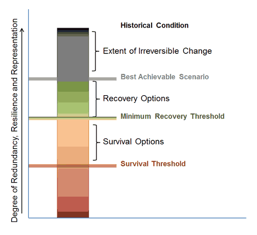 Figure 1 is a graphic representation of a conceptual model of recovery and survival. It expresses the following ideas: The Survival Threshold represents a lower degree of redundancy, resilience and representation than does the Minimum Recovery Threshold and there are a range of survival options between these two thresholds. Above the Minimum Recovery Threshold there are a range of recovery options. The Best Achievable Scenario is the best of these options that can be achieved given the extent of irreversible change from the historic condition of the species.
