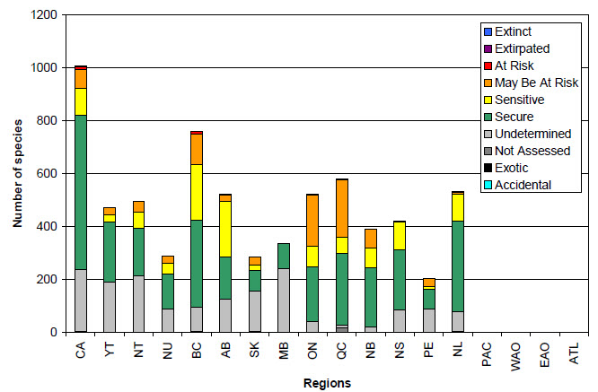 Figure 7 shows the results of the general status assessments for moss species in Canada in the Wild Species 2010 report. The bar graph shows the number of moss species ranked as Extinct, Extirpated, At Risk, May Be at Risk, Sensitive, Secure, Undetermined, Not assessed, Exotic, and Accidental in Canada, each province and territory and the 4 oceanic regions. Of the 1006 species occurring in Canada, 1 was ranked as Extinct, 1 as Extirpated, 10 as At Risk, 71 as May Be at Risk, 103 as Sensitive, 581 as Secure, 235 as Undetermined, and 4 as Exotic. Of the 473 species occurring in the Yukon, 30 were ranked as May Be at Risk, 27 as Sensitive, 226 as Secure, and 190 as Undetermined. Of the 495 species occurring in the Northwest Territories, 39 were ranked as May Be at Risk, 62 as Sensitive, 180 as Secure, and 214 as Undetermined. Of the 290 species occurring in Nunavut, 1 was ranked as At Risk, 28 as May Be at Risk, 40 as Sensitive, 133 as Secure, and 88 as Undetermined. Of the 760 species occurring in British Columbia, 9 were ranked as At Risk, 115 as May Be at Risk, 213 as Sensitive, 327 as Secure, 93 as Undetermined and 3 as Exotic. Of the 522 species occurring in Alberta, 2 were ranked as At Risk, 24 as May Be at Risk, 211 as Sensitive, 159 as Secure and 126 as Undetermined. Of the 286 species occurring in Saskatchewan, 1 was ranked as At Risk, 31 as May Be at Risk, 20 as Sensitive, 76 as Secure, 154 as Undetermined and 4 as Not Assessed. Of the 335 species occurring in Manitoba, 93 were ranked as Secure and 242 as Undetermined. Of the 522 species occurring in Ontario, 1 was ranked as Extinct, 1 as Extirpated, 1 as At Risk, 192 as May Be at Risk, 79 as Sensitive, 206 as Secure, 41 as Undetermined and 1 as Exotic. Of the 579 species occurring in Quebec, 1 was ranked as Extirpated, 217 as May Be at Risk, 62 as Sensitive, 272 as Secure, 9 as Undetermined, 16 as Not Assessed, and 2 as Exotic. Of the 390 species occurring in New Brunswick, 71 were ranked as May Be at Risk, 76 as Sensitive, 221 as Secure, 21 as Undetermined and 1 as Exotic. Of the 419 species occurring in Nova Scotia, 2 were ranked as May Be at Risk, 105 as Sensitive, 226 as Secure and 86 as Undetermined. Of the 204 species occurring in Prince Edward Island, 32 were ranked as May Be at Risk, 9 as Sensitive, 75 as Secure and 88 as Undetermined. Of the 531 species occurring in Newfoundland and Labrador, 1 was ranked as At Risk, 7 as May Be at Risk, 101 as Sensitive, 344 as Secure, 74 as Undetermined and 4 as Exotic. There were no species listed as occurring in the oceanic regions.