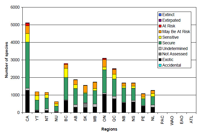 Figure 8 shows the results of the general status assessments for vascular plant species in Canada in the Wild Species 2010 report. The bar graph shows the number of vascular plant species ranked as Extinct, Extirpated, At Risk, May Be at Risk, Sensitive, Secure, Undetermined, Not assessed, Exotic, and Accidental in Canada, each province and territory and the 4 oceanic regions. Of the 5111 species occurring in Canada, 25 were ranked as Extirpated, 136 as At Risk, 444 as May Be at Risk, 484 as Sensitive, 2635 as Secure, 112 as Undetermined, 23 as Not Assessed, and 1252 as Exotic. Of the 1183 species occurring in the Yukon, 1 was ranked as Extirpated, 1 as At Risk, 218 as May Be At Risk, 256 as Sensitive, 549 as Secure, 38 as Undetermined, 20 as Not Assessed, and 100 as Exotic. Of the 1158 species occurring in the Northwest Territories, 146 were ranked as May Be at Risk, 187 as Sensitive, 602 as Secure, 103 as Undetermined, 3 as Not Assessed and 117 as Exotic. Of the 626 species occurring in Nunavut, 137 were ranked as May Be at Risk, 111 as Sensitive, 296 as Secure, 39 as Undetermined, 29 as Not Assessed and 14 as Exotic. Of the 2801 species occurring in British Columbia, 2 were ranked as Extirpated, 46 as At Risk, 229 as May Be At Risk, 523 as Sensitive, 1282 as Secure, 28 as Undetermined, 17 as Not Assessed and 674 as Exotic. Of the 1874 species occurring in Alberta, 1 was ranked as Extirpated, 6 as At Risk, 270 as May Be At Risk, 221 as Sensitive, 924 as Secure, 148 as Undetermined, 4 as Not Assessed and 300 as Exotic. Of the 1558 species occurring in Saskatchewan, 3 were ranked as Extirpated, 11 as At Risk, 388 as May Be At Risk, 49 as Sensitive, 549 as Secure, 30 as Undetermined, 236 as Not Assessed and 292 as Exotic. Of the 1740 species occurring in Manitoba, 13 were ranked as At Risk, 360 as May Be at Risk, 117 as Sensitive, 768 as Secure, 168 as Undetermined, 1 as Not Assessed and 313 as Exotic. Of the 3099 species occurring in Ontario, 25 were ranked as Extirpated, 62 as At Risk, 427 as May Be at Risk, 149 as Sensitive, 1312 as Secure, 73 as Undetermined and 1051 as Exotic. Of the 2510 species occurring in Quebec, 11 were ranked as Extirpated, 47 as At Risk, 265 as May Be at Risk, 272 as Sensitive, 984 as Secure, 142 as Undetermined, 30 as Not Assessed and 759 as Exotic. Of the 1690 species occurring in New Brunswick, 6 were ranked as Extirpated, 10 as At Risk, 161 as May Be at Risk, 114 as Sensitive, 810 as Secure, 31 as Undetermined and 558 as Exotic. Of the 1695 species assessed in Nova Scotia, 11 were ranked as Extirpated, 9 as At Risk, 160 as May Be at Risk, 126 as Sensitive, 699 as Secure, 74 as Undetermined and 616 as Exotic. Of the 1076 species occurring in Prince Edward Island, 8 were ranked as Extirpated, 1 as At Risk, 188 as May Be at Risk, 86 as Sensitive, 381 as Secure, 44 as Undetermined and 368 as Exotic. Of the 1272 species occurring in Newfoundland and Labrador, 18 were ranked as At Risk, 167 as May Be at Risk, 167 as Sensitive, 485 as Secure, 136 as Undetermined, 15 as Not Assessed and 284 as Exotic. There were no species listed as occurring in the oceanic regions.