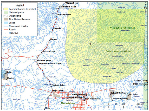 | 18 | Used to be many caribou in this area but have declined. Trappers believe they moved north (west of Grand Rapids Wildland). Most highly developed section in area (Husky, ENCANA, CNRL) |