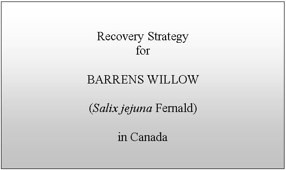 Under the Accord for the Protection of Species at Risk (1996), the federal, provincial, and territorial governments agreed to work together on legislation, programs, and policies to protect wildlife species at risk throughout Canada. In the spirit of cooperation of the Accord, the Government of Newfoundland and Labrador has given permission to the Government of Canada to adopt the Recovery strategy for Barrens Willow under Section 44 of the Species at Risk Act (SARA). Details are provided in an Addendum to this document. This recovery strategy is the recovery strategy of the Minister of the Environment of Canada for this species. October 2006 |