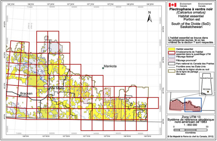 - Figure 5. Critical habitat for the Chestnut-collared Longspur in the western portion of southwestern Saskatchewan is represented by the yellow shaded polygons comprising 489,078 ha, where the criteria and methodology set out in Section 7.1 are met. The 10 km x 10 km UTM grid overlay shown on this figure is a standardized national grid system that indicates the general geographic area containing critical habitat. Areas outside of the yellow shaded units do not contain critical habitat.