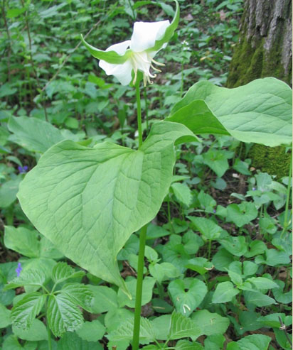 Drooping Trillium is a perennial herb in the lily family. It has a sturdy upright stem that stands 15 to 60 centimetres tall, and a single flowering stalk at the junction of three leaves that sharply curves and grows 3 to 12 centimetres downward. The flower is normally white but can be reddish or maroon.