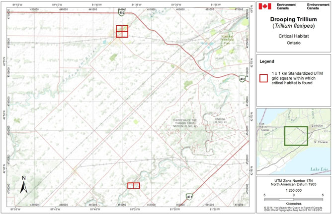 Identification of critical habitat is not a component of the provincial recovery strategy under the Province of Ontario's ESA. Under the ESA, when a species becomes listed as endangered or threatened on the Species at Risk in Ontario List, it automatically receives general habitat protection. Drooping Trillium currently receives general habitat protection under the ESA; however, a description of the general habitat has not yet been developed. In some cases, a habitat regulation may be developed that replaces the general habitat protection. A habitat regulation is a legal instrument that prescribes an area that will be protected Footnote10 as the habitat of the species by the Province of Ontario. A habitat regulation has not been developed for the Drooping Trillium under the ESA, therefore, this federal recovery strategy identifies critical habitat for the Drooping Trillium to the extent possible, based on the best available information as of May 2014. Critical habitat is identified for the two extant populations of Drooping Trillium in Ontario and is sufficient to meet the population and distribution objective; therefore a schedule of studies is not required. More precise boundaries may be mapped, and additional critical habitat may be added in the future if new or additional information supports the inclusion of areas beyond those currently identified (e.g., new sites become colonized downstream or in adjacent areas).