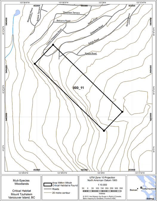 Within the geographical boundaries identified in Figure 6 (Mount Tzuhalem, private land portion), Figure 9 (Beacon Hill), Figure 10 (Creed Road), and Figure 11 (Skirt Mountain), critical habitat is identified as all areas within 20 metres of the recorded location of each patch of Deltoid Balsamroot (GOERT 2008; GOERT 2009). Surveys of these areas confirmed the continued existence of the species and its habitat at the sites and provided partial information on habitat and location. In addition, data from the BC Conservation Data Center (2012) is accepted as the best available information for the location of a newly discovered sub-population on Skirt Mountain.